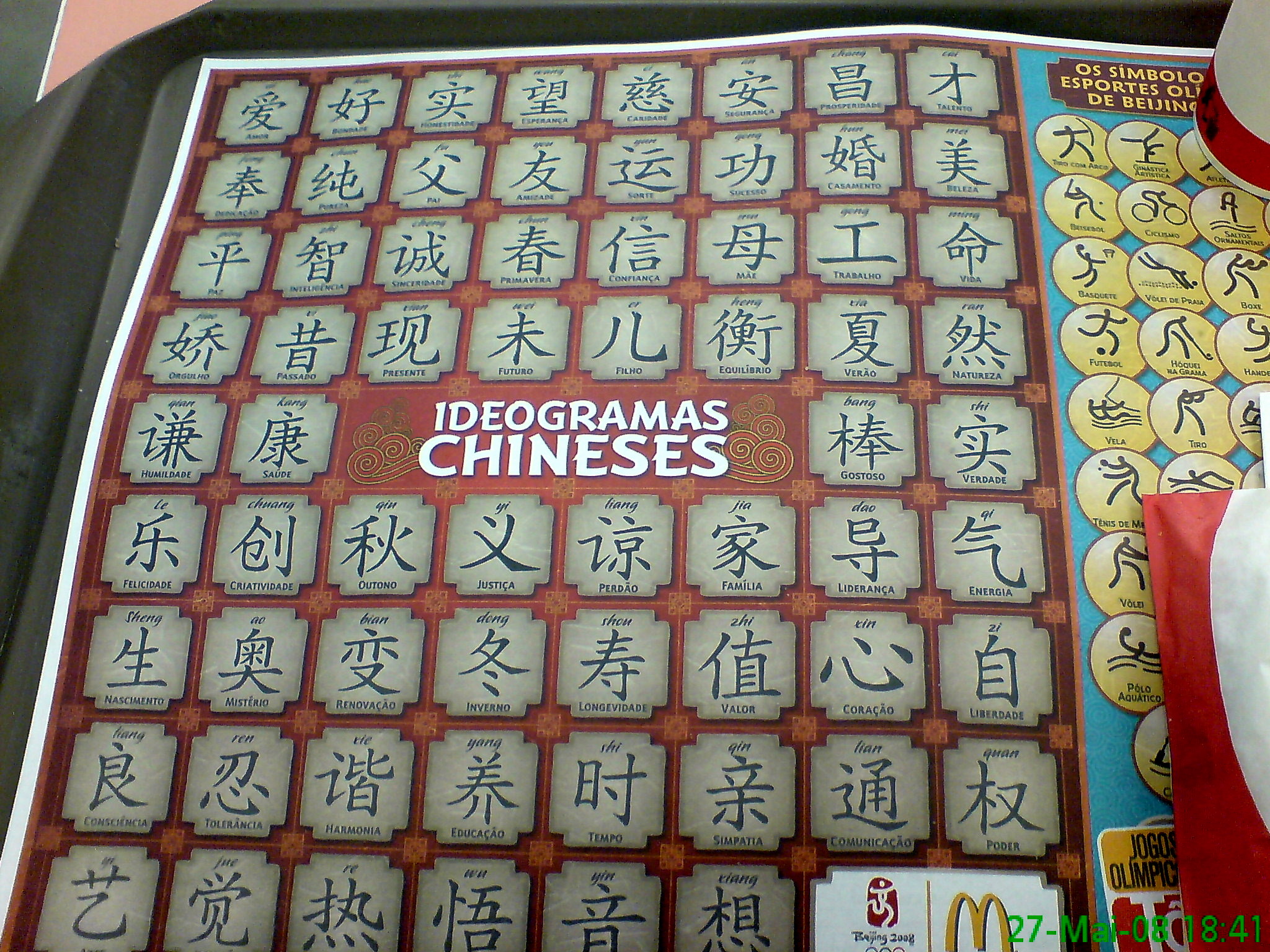 Hoje tirei esta foto da atual bandeja do McDonalds, cujo tema é “Ideogramas Chineses” devido aos jogos olímpicos de Pequim.