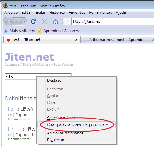 Uma outra forma bastante prática para fazer uma pesquisa no Firefox é definindo uma palavra-chave de pesquisa. Para fazer isso, clique com o botão direito na caixa de texto do Jiten.net e escolha o menu “Criar palavra-chave de pesquisa…” (em inglês será “Add a Keyword for this Search…”).