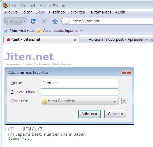 Na janela que vai se abrir, digite “Jiten.net” no nome e escolha uma palavra-chave. Pode ser qualquer coisa, de preferência bem simples. No meu exemplo (imagem abaixo) coloquei apenas a letra “j”.