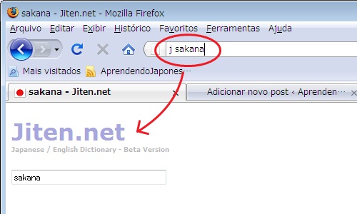 Pronto! Agora você pode utilizar a barra de endereços do navegador para fazer suas pesquisas. É só digitar a palavra chave e a palavra que quer procurar. No meu exemplo, para procurar “sakana” digitei “j sakana”: