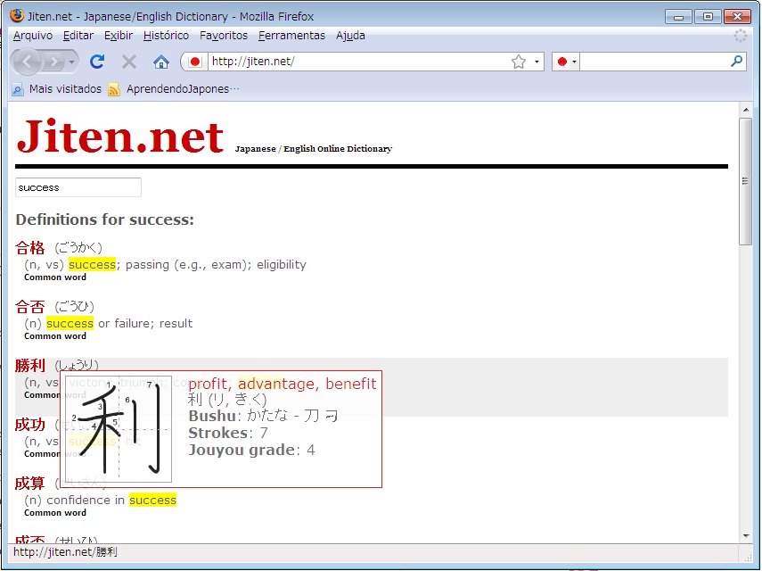 Apesar da interface simples, esta ferramenta ainda oferece bastante flexibilidade nas consultas. Fiz alguns exemplos utilizando alguns termos de pesquisa e você pode clicar neles para ver como fica o resultado no Jiten.net: