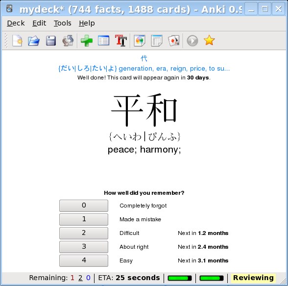 O funcionamento é bem simples. Um kanji (ou palavra ou frase) é mostrado e você precisa ver se consegue lembrar seu significado (ou vice-versa). Você não precisa digitar a resposta para o software ver se está certo, basta olhar e você mesmo julga se conseguiu lembrar bem ou não. De acordo com sua resposta, o intervalo de tempo para a carta aparecer de novo será diferente.