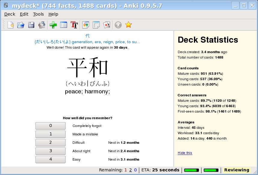 Se você não conhece o Anki, precisa conhecer! Estou usando há uns três meses e meio (devia ter escrito um post antes!) e é agora uma das principais ferramentas para me ajudar nos estudos. O Anki é um Spaced Repetition System, ou SRS pra facilitar. A idéia é semelhante aos flashcards, em que você cadastra pares de significado/kanji (ou pode ser palavras ou frases) e estes são exibidos para testar sua memória. Mas, diferente dos flashcards convencionais, no SRS as cartas não aparecem de forma aleatória: quanto melhor você aprende uma carta, mais tempo ela vai demorar para aparecer de novo. Desta forma você se concentra naquilo que está aprendendo e minimiza o tempo gasto com coisas que já sabe.