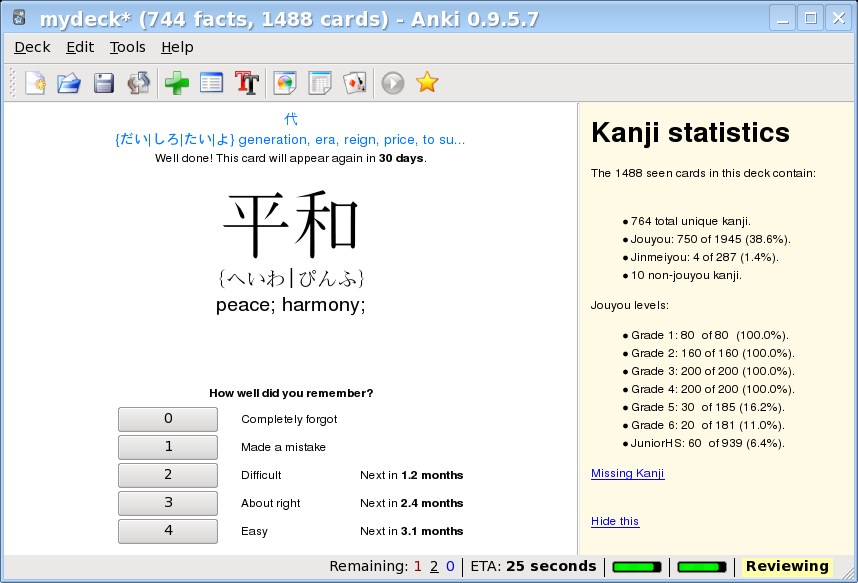 • Se as cartas começarem a ficar muito confusas, coisa comum de acontecer se você adiciona kanjis isolados, reduza a velocidade que você está adicionando cartas. Provavelmente você está adicionando mais rápido do que consegue aprender! Amadureça as cartas existentes e só depois continue.